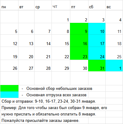 График работы в праздничные дни: Выходные дни с 29/12/24 по 08/01/25 Отправка ТК: Последняя отправка в 2025 году 27 декабря. Для того, что бы Ваш заказ отправился 27 декабря, его нужно прислать и оплатить до 25 декабря, до 18:00. Первый сбор заказов в 2026 году - 9 января 2026г, отгрузка 10 января 2026 года. Заказы можно оформлять на сайте 24/7, в любые дни.